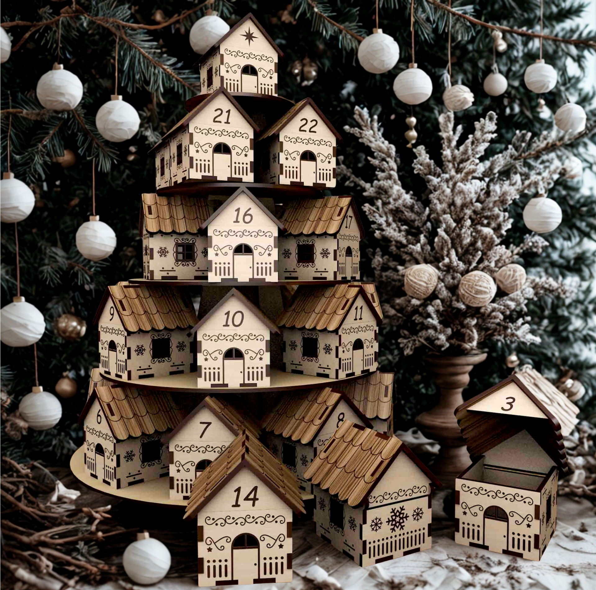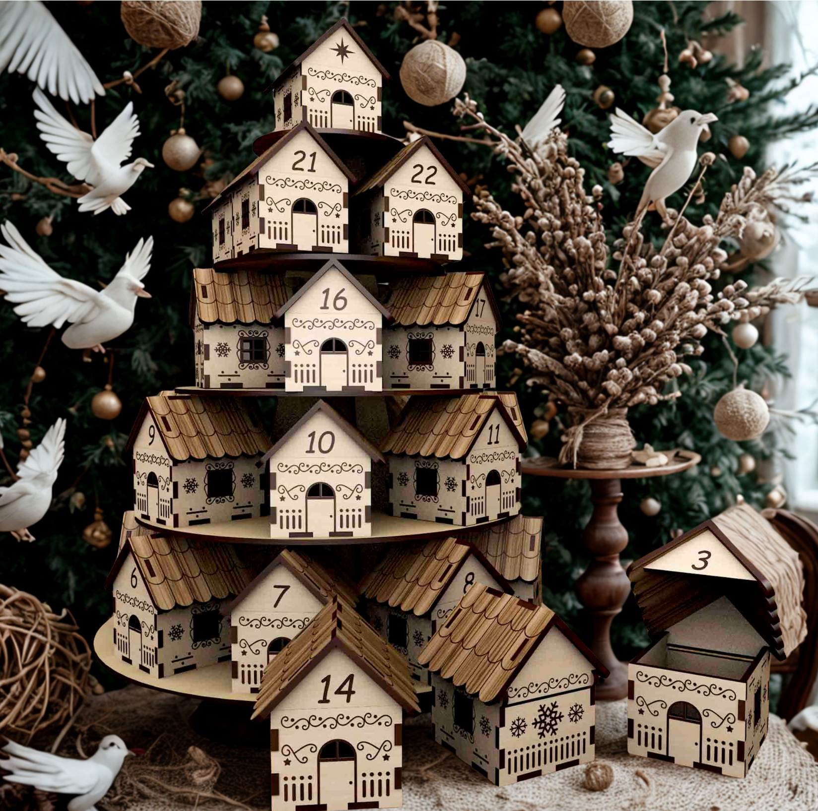 Elevate your holiday celebrations with our Christmas advent calendar featuring 25 exquisite count down houses. Each house is meticulously crafted from wood, measuring 70 x 75 x 65 mm for a delightful aesthetic. The set includes a sturdy stand measuring 300mm x 300mm and standing at 350mm high, offering a stylish display for your festive countdown. Add your own gifts to each house to make this season truly magical.