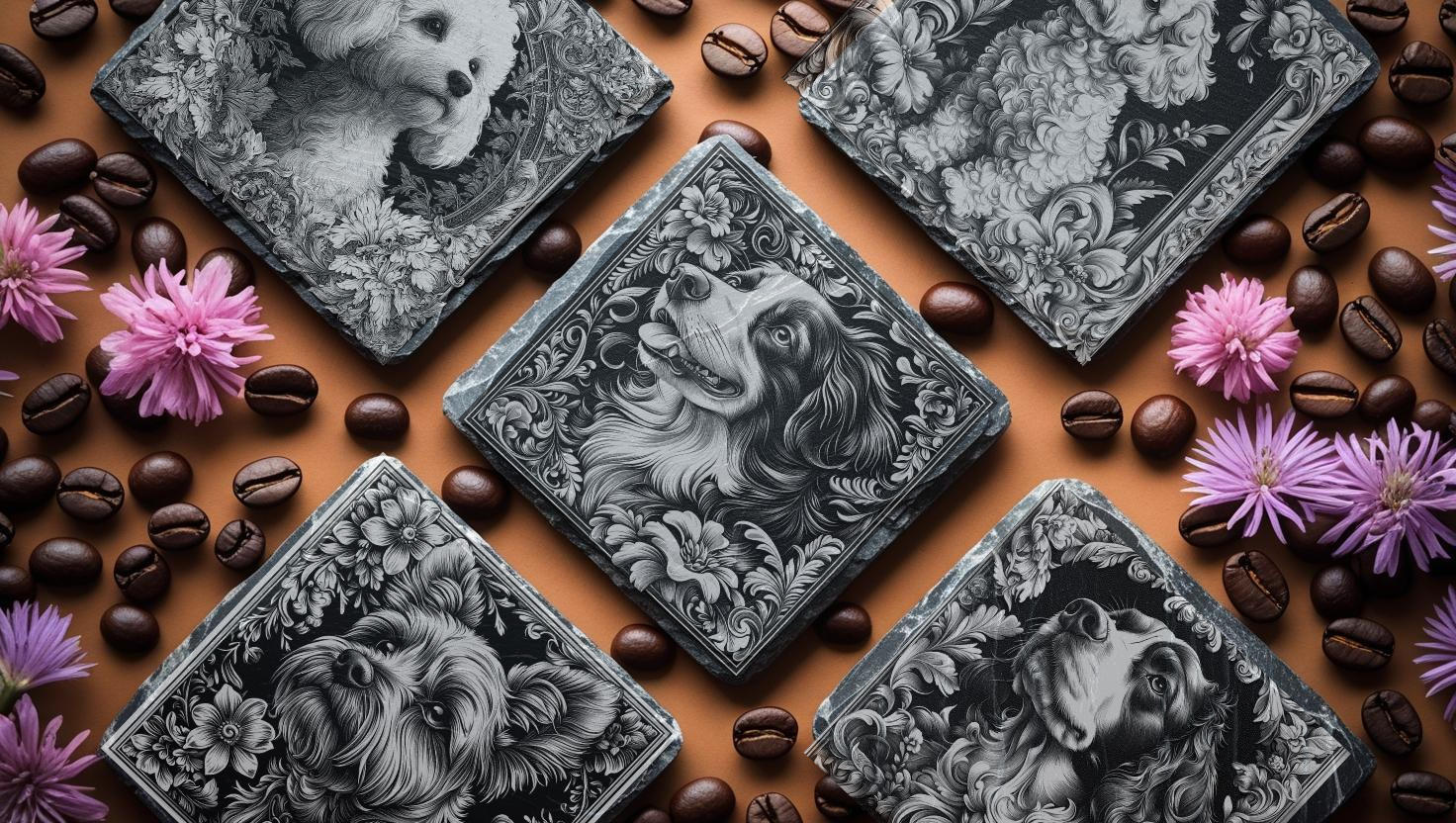 Crafted from natural slate, these engraved coasters showcase detailed depictions of various dog breeds, combining durability with elegant design. Ideal for dog lovers seeking a sophisticated way to protect surfaces, each coaster offers a unique breed illustration engraved with precision, ensuring a lasting tribute to your favourite canine companion. Perfect for home or office, these coasters blend functionality with expert craftsmanship.