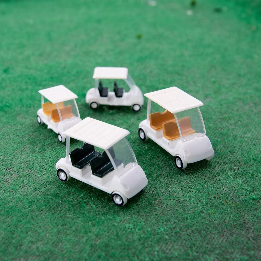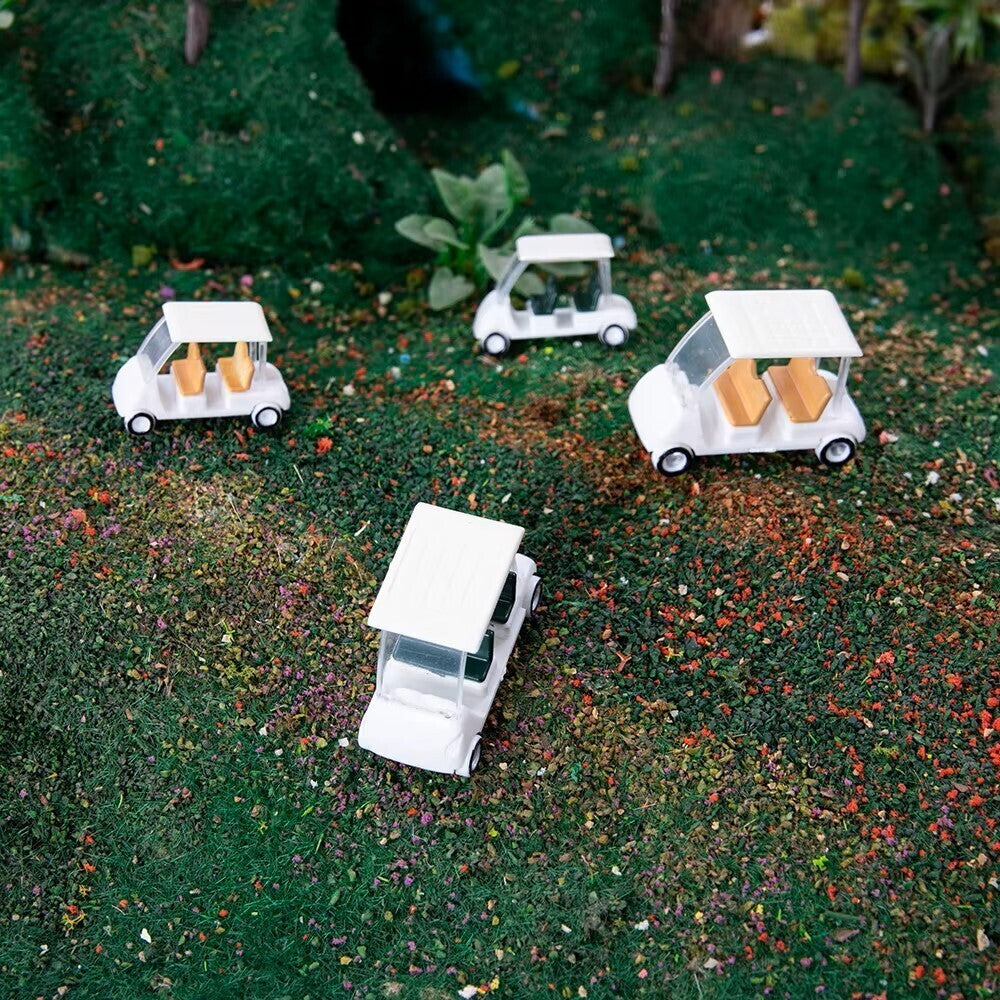 Model railway golf carts that add instant resort detail to your layout: crisp white bodies, clear windshields, and tiny seats ready for passengers. Set these miniature golf carts beside your station, clubhouse, campground, or hotel drive and watch the scene feel lived-in, like a sunny afternoon captured in scale. Each cart has a clean, glossy finish with delicate roof lines and small rolling-style wheels that look right at home on turf, gravel paths, or a platform edge. The mix of seat colors brings subtle variation, so your model railroad scenery feels less staged and more like a real place with real traffic.