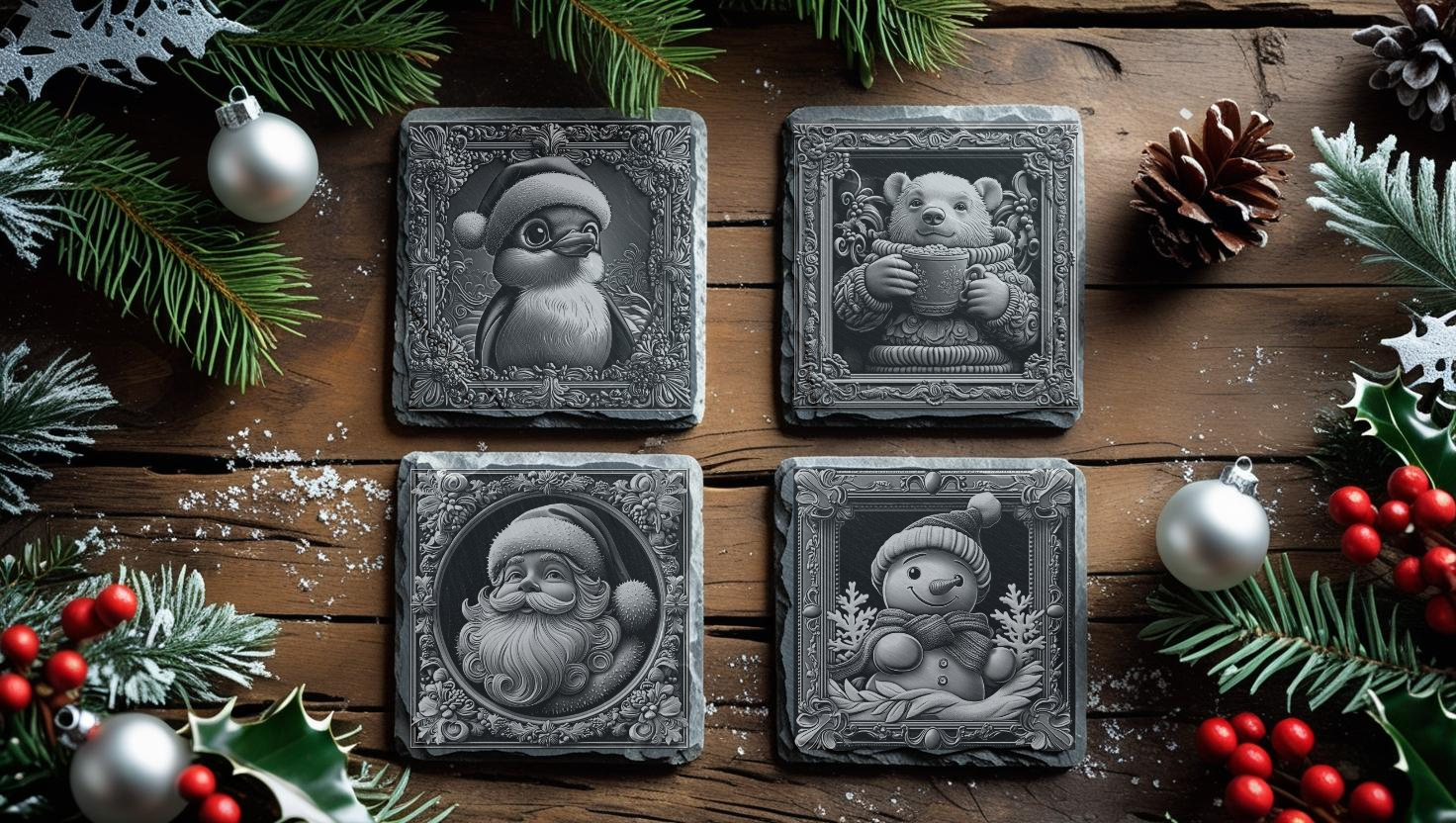 This set of four real slate coasters features expertly engraved Christmas designs, combining natural stone durability with festive elegance. Each coaster offers a unique seasonal motif, making them perfect for protecting surfaces while adding a refined holiday touch to your home or gifting them to loved ones. Crafted from genuine slate, they provide both functionality and timeless style.